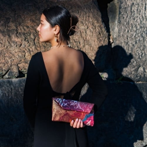 エレガントで優雅なパーティードレスに、カジュアルなタウンウエアにもぴったりなクラッチバッグです。チェーンを付ければショルダーバッグへ変化します。どんなシーンにも身に纏うことができる、Kimono Tangoクラッチバッグです。