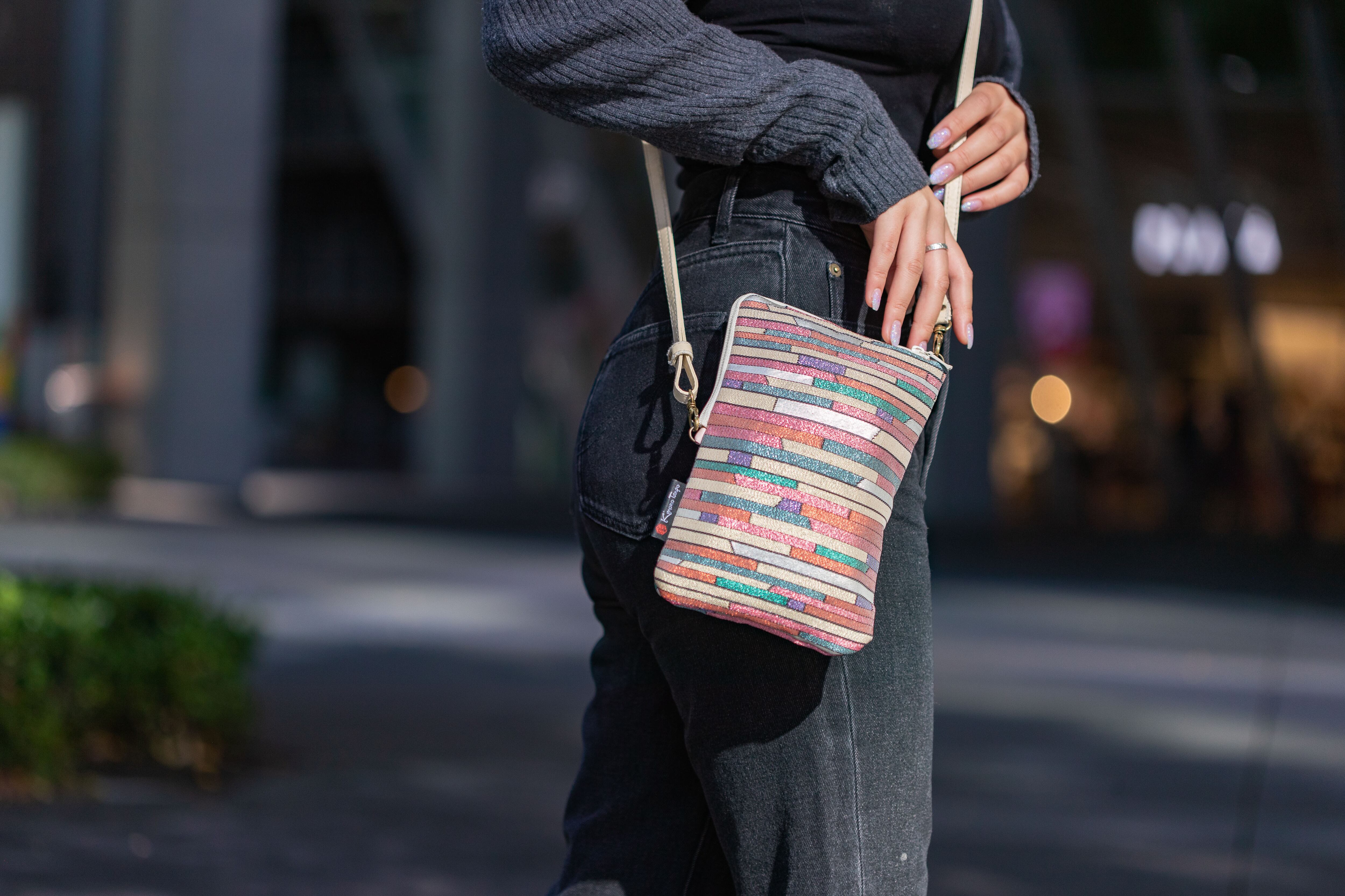 Kimono Tangoのサコッシュは、コンパクトかつ軽量なデザインで、旅行やアウトドア、日常使いに最適。カジュアルなアイデムでありながら、素材の西陣錦織が上品な高級感をさりげなく表現します。